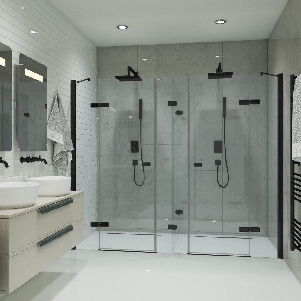 Душевое ограждение двойное с перегородкой с открыванием в обе стороны на 360° и стенным креплением на профиле TREND RECTAN GK-886PT производства фабрики GuteWetter.