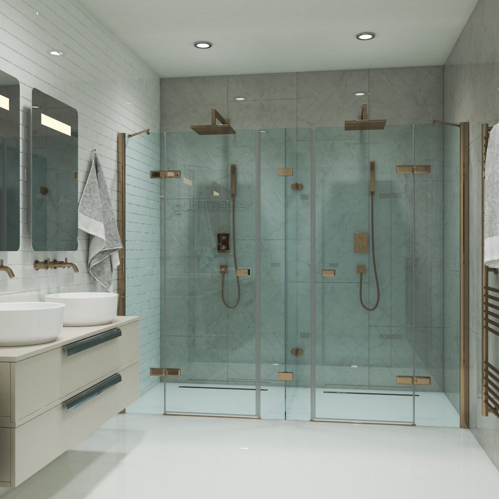 Душевое ограждение двойное с перегородкой с открыванием в обе стороны на 360° и стенным креплением на профиле TREND RECTAN GK-886PT производства фабрики GuteWetter.