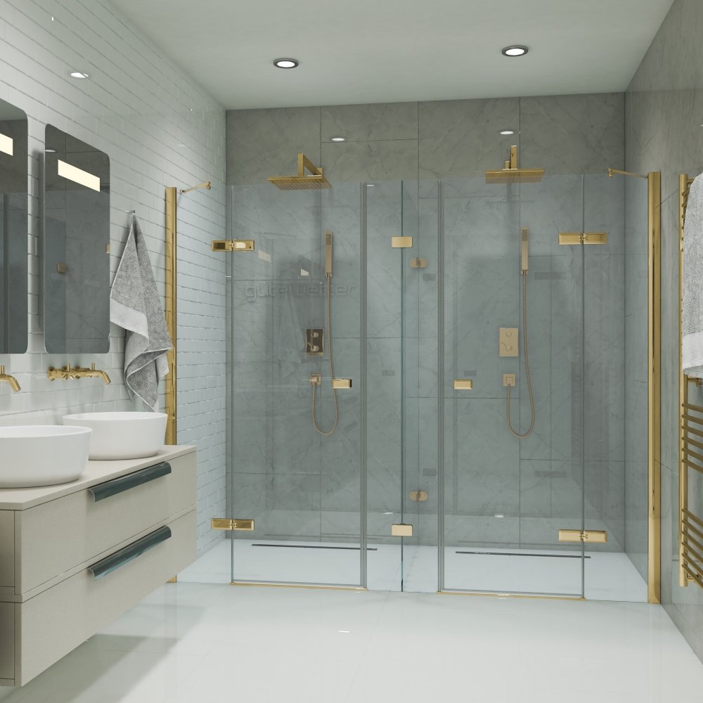 Душевое ограждение двойное с перегородкой с открыванием в обе стороны на 360° и стенным креплением на профиле TREND RECTAN GK-886PT производства фабрики GuteWetter.
